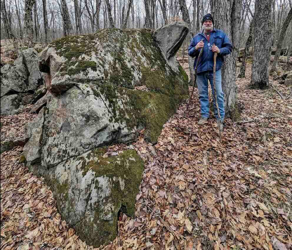 John and I took a hike on a section of the Ice Age Trail yesterday looking for the mysterious Turtle Rock, and we actually found it. It’s located along the old Native American canoe portage around the Grandfather Falls of the Wisconsin River, on the west side of the river.