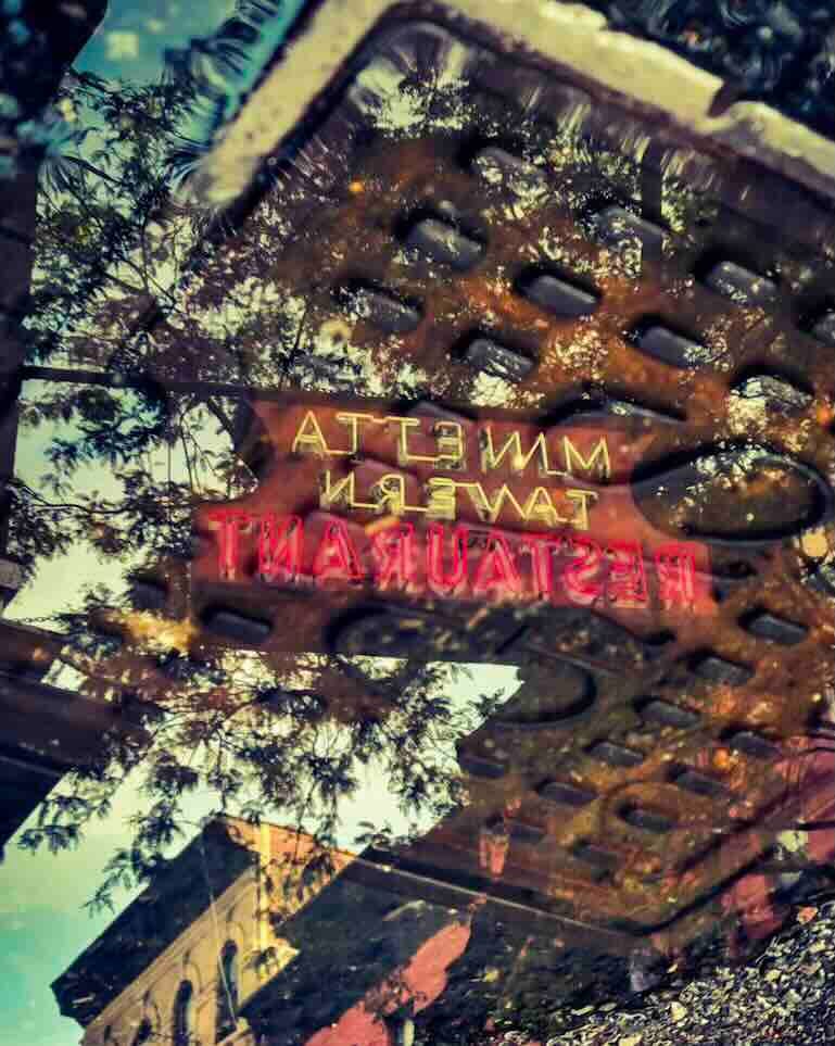 Shot on Minetta lane just west of Macdougal looking south east into a gas untily grate with Minetta Tavern neon sign in the reflection.