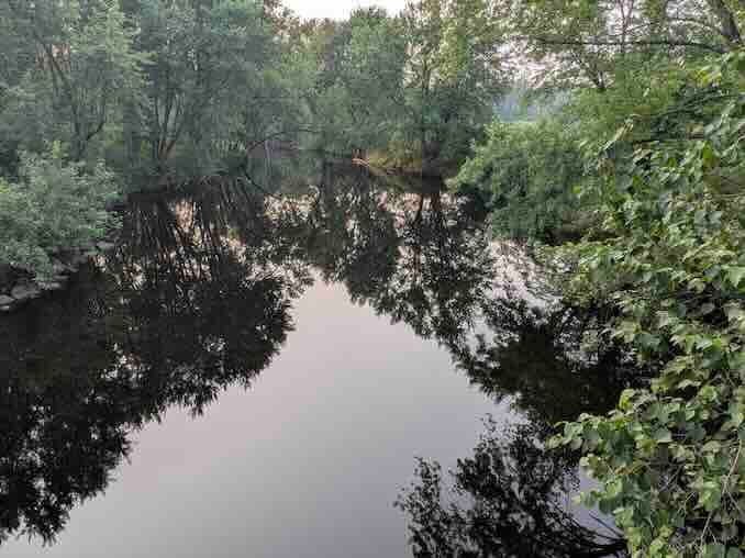 Reflections in the Pine River, on a quiet evening in the Town of Pine River. A lot of Canadian wildfire smoke in the air again. That's what's making that pink haze.